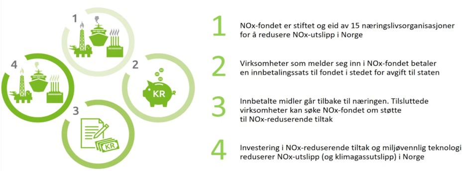Den statlige NOx-avgiften ble innført i 2007 og var på 15 kroner per kilo NOx-utslipp. Dette ble økonomisk krevende for mange virksomheter. Flere ulike næringsorganisasjoner anbefalte derfor sammen en løsning med et NOx-fond, til erstatning for avgiften, for å oppnå størst mulig miljøgevinst i forhold til påløpte kostnader for virksomhetene. Det ble startet forhandlinger med myndighetene om en NOx-avtale som gjorde dette mulig. NOx-fondet fikk fart på arbeidet med å kutte NOx-utslipp, ved å gi næringslivet økonomisk støtte til å implementere grønn teknologi.